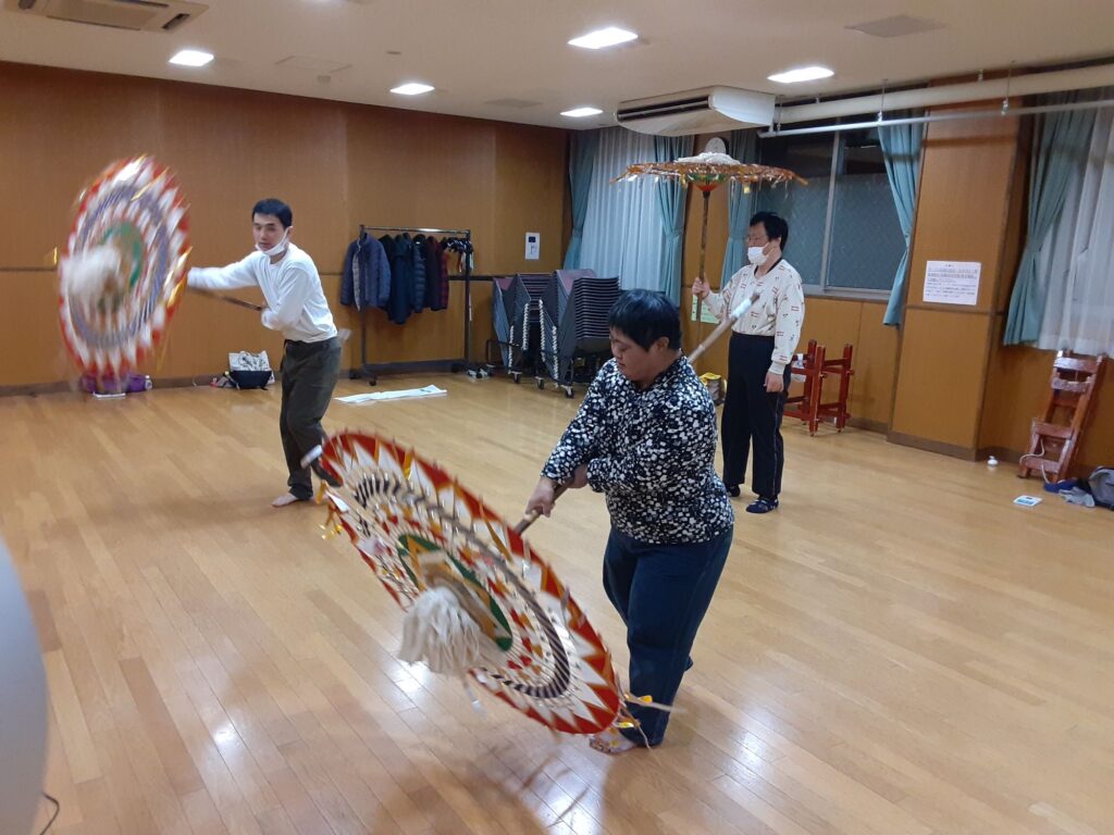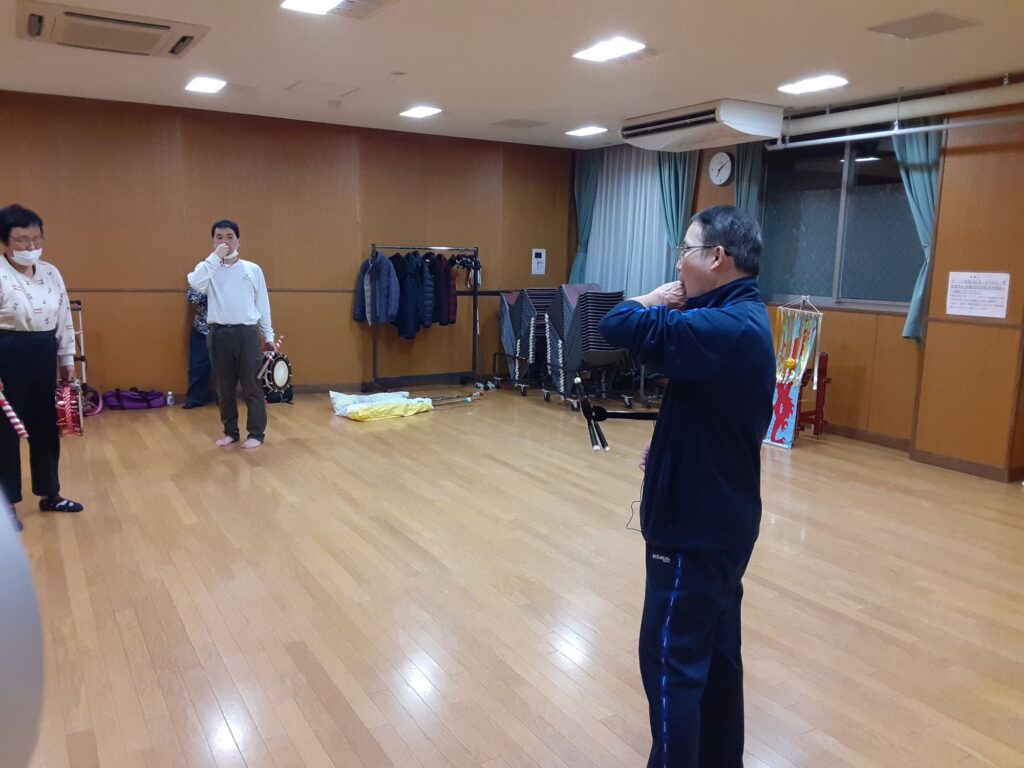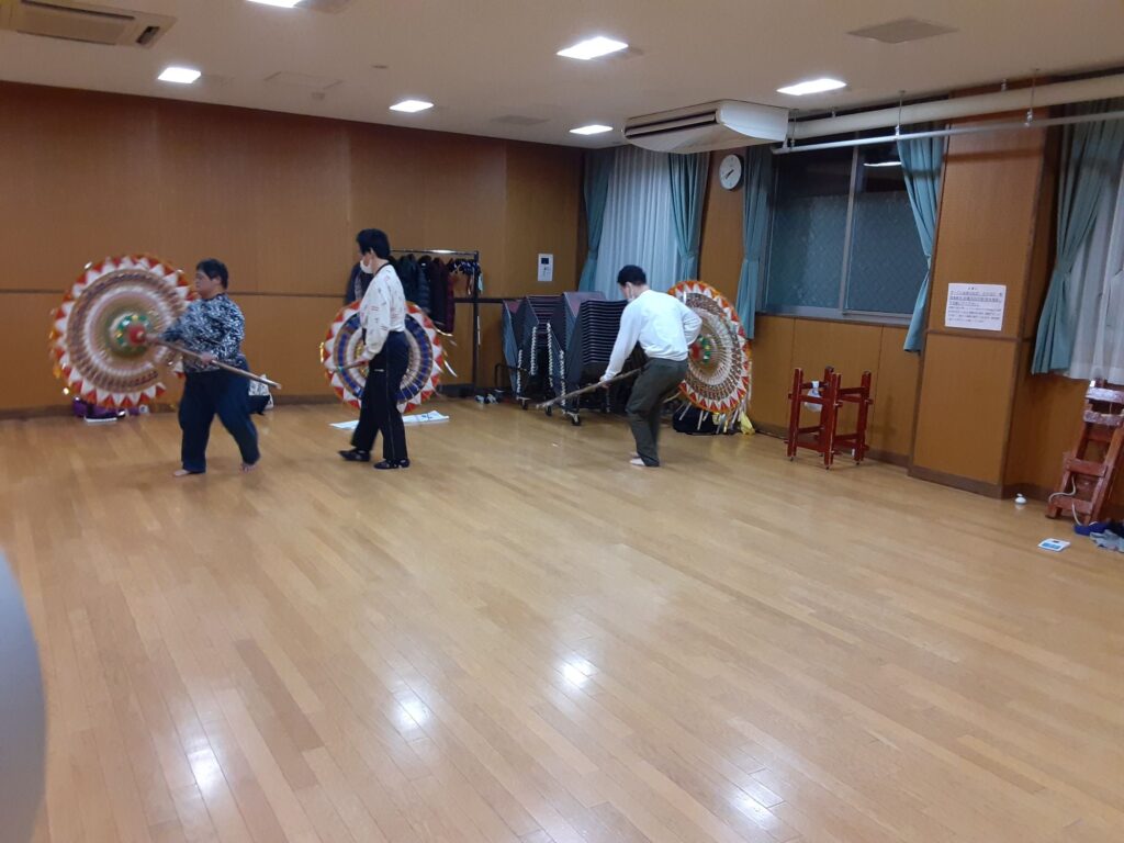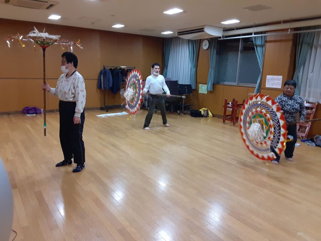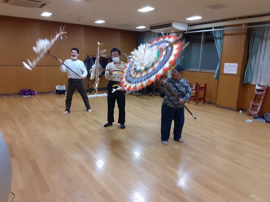 今日は、私を含め4人で練習しました。指笛、エイサー、傘踊り、獅子舞(一人立ち)、仮面太鼓そして大蛇、秩父屋台囃子の練習をしました。