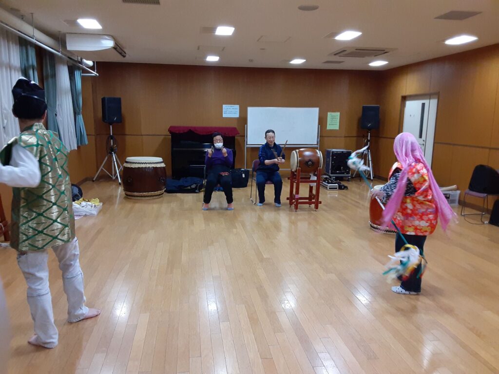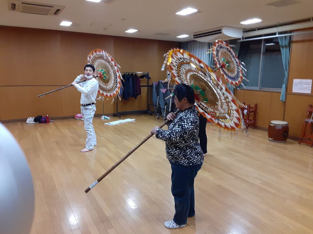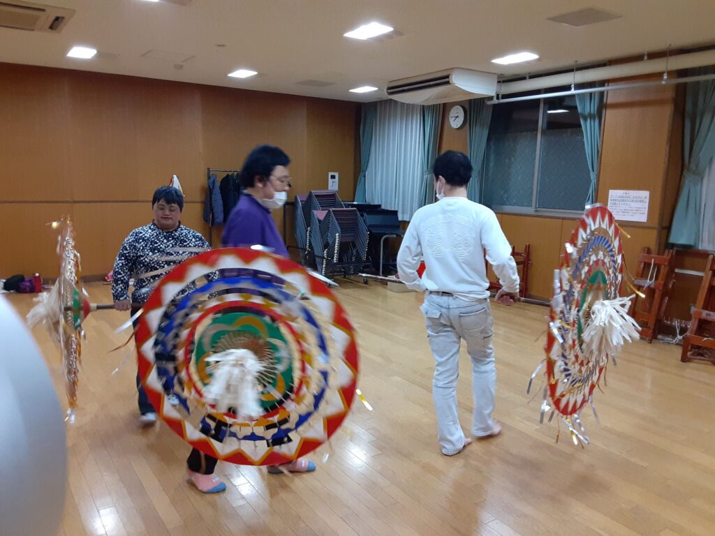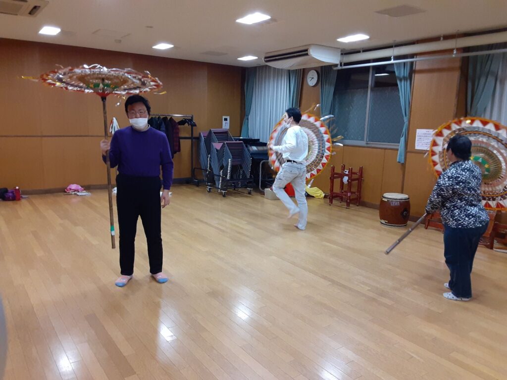 今日は、私を含め4人で練習しました。指笛、エイサー、傘踊り、獅子舞(一人立ち)、仮面太鼓そして大蛇、秩父屋台囃子の練習をしました。