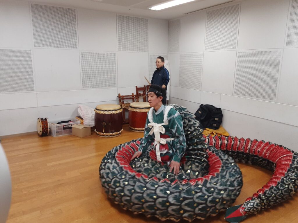 今日は、メンバー一人と私の2人で練習しました。傘踊り、ソーラン節、秩父屋台囃子、ぶち合わせ太鼓、荒馬踊り、三宅島太鼓、仮面太鼓そして大蛇、八丈島太鼓、指笛、エイサーの練習をしました。