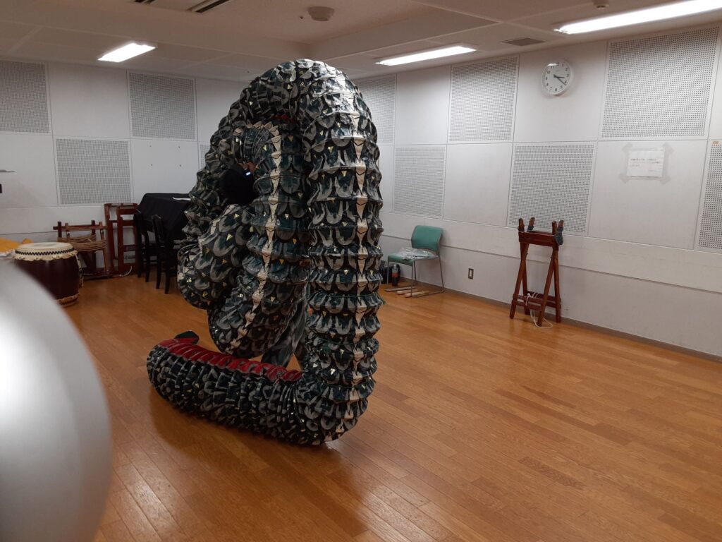 今日は、私を含め4人で練習しました。指笛、エイサー、傘踊り、獅子舞(一人立ち)、仮面太鼓そして大蛇、秩父屋台囃子の練習をしました。尚、今日も見学者の方が一人みえました。